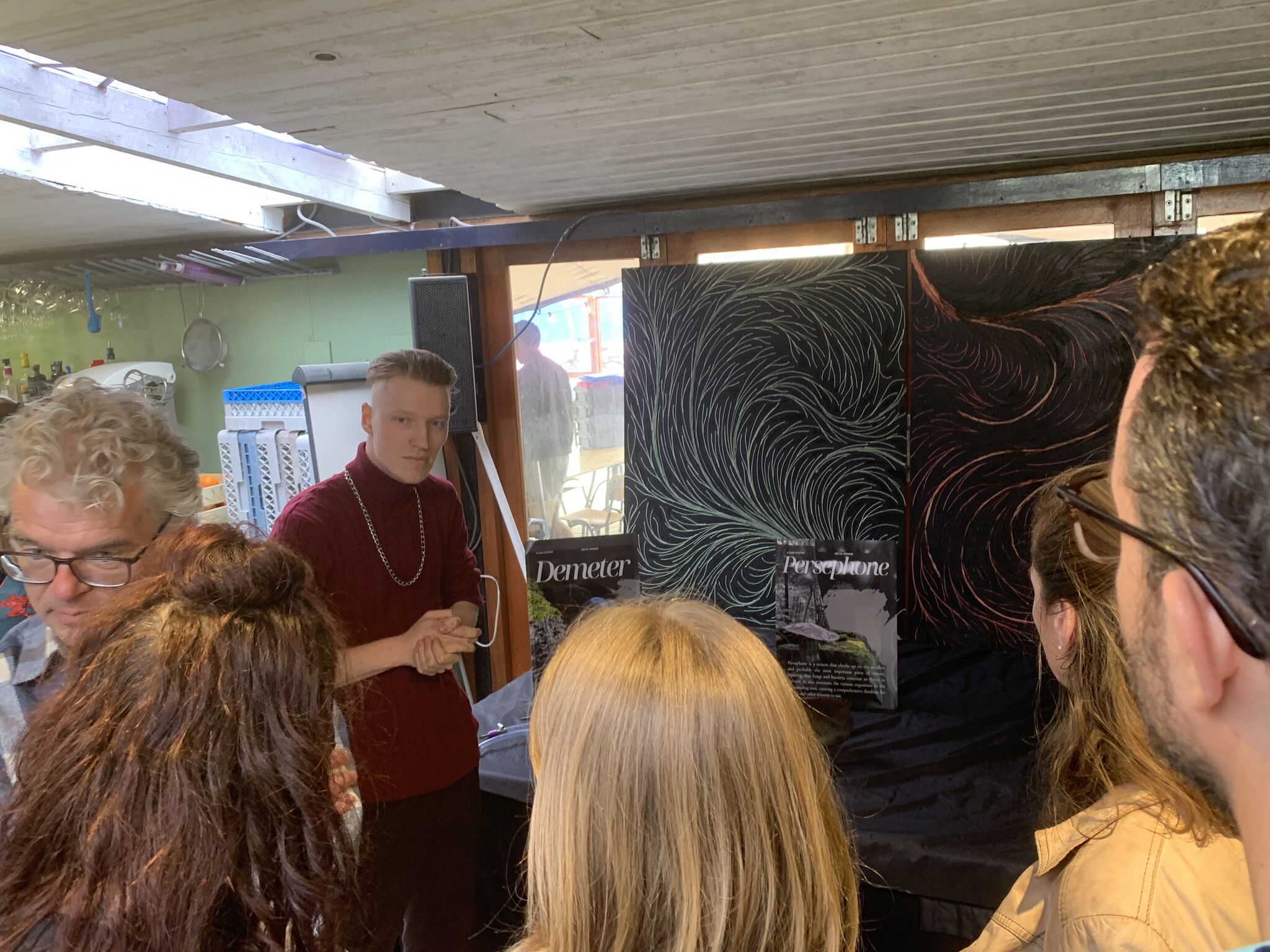 Het werk “GAIA” van Daan: Wat als we als de natuur zometeen zichzelf niet meer kan helpen, de grond te zuur voor alle micro-organismen en te weinig grondstoffen voor onze planten? GAIA staat als een distopion bedrijf dat de functie heeft overgenomen van sommige biologische systemen systemen.