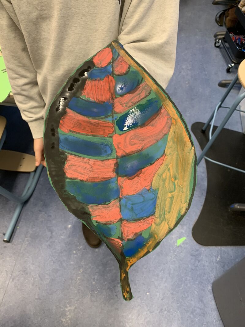 De kinderen hadden veel goede vragen en maakten hierna prachtige bladeren. De bladeren vormen het bladerdak van de tentoonstelling 450 jaar bescherming van het Haagse Bos door de Akte van Redemptie.